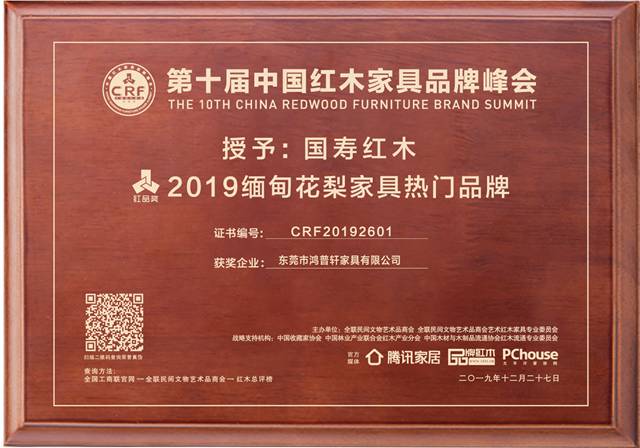 12月27日,荣获“2019红木家具十大影响力品牌”、“2019缅甸花梨家具热门品牌”大奖,连续5年当选全联艺术红木家具专业委员会主席团主席单位;同期于武汉·东湖国际会议中心发布《《国寿红木新十年品牌战略规划》。