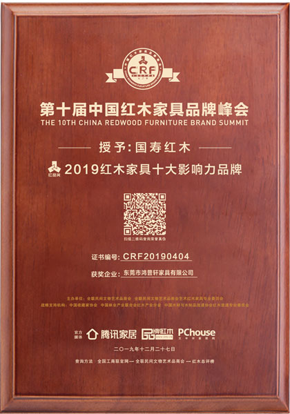 1月8日,第九届中国红木家具品牌盛典,国寿红木荣获“2018红木家具十大影响力品牌”大奖。