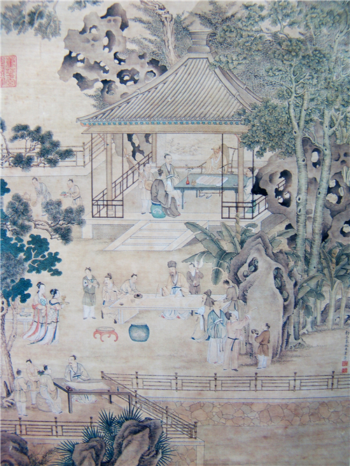 如仇英的《临宋人画轴》就展示了一个并不奢华却意境别致的明代文人书房。画面中心一屏一榻,屏是独扇的山水插屏,榻上坐一个文人,脚下是一个脚踏;床右侧置一靠几,既可靠在身后,又可搭放脚足。画面右侧的书案、绣墩显然并非名贵木材制成,但案上书卷琴棋整齐有序。床榻旁站一童子,手持注子向盏中注酒。酒盏边除了果盘之外,又设砚台一方。画面左下角是一个茶炉,纱罩下放着饮茶用的托盏。明代文人书房中通常少不了两样东西,一是琴,因为要携琴访友;一是茶炉,讲究烹茶待客。