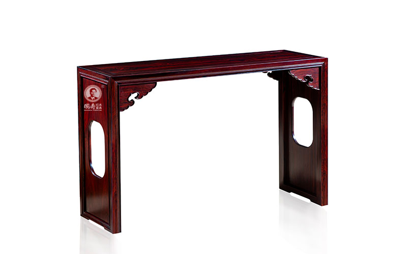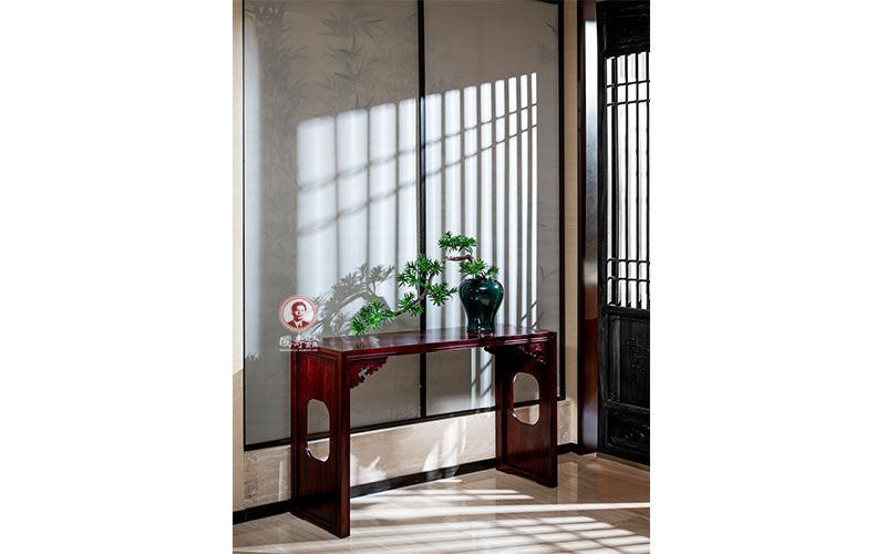 造型严谨考究,结构牢靠。两侧各设椭圆形开光,别致新颖,颇有特色。角牙雕作如意云头纹,增加了清新高雅的文人意境。桌面攒边打槽装板,形成空腔的共鸣箱,是为功能和形式完美结合之佳作。