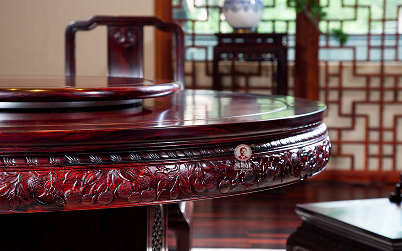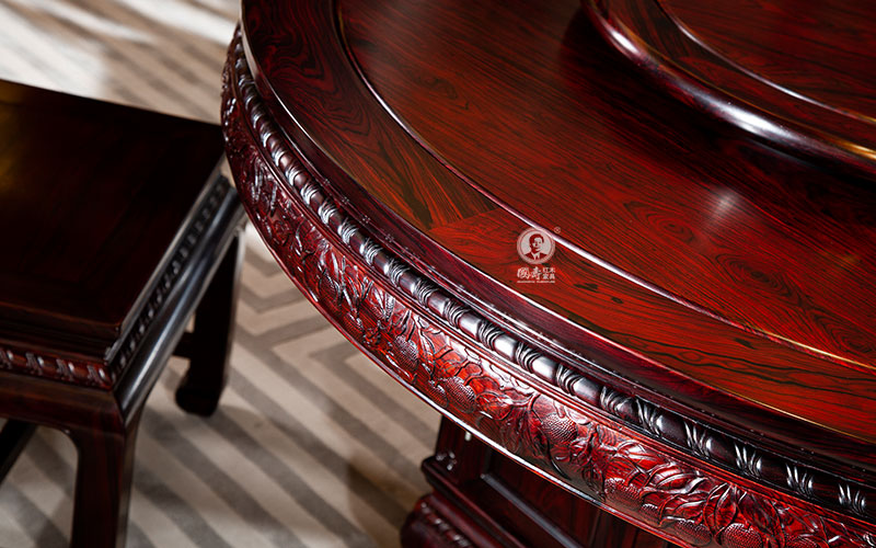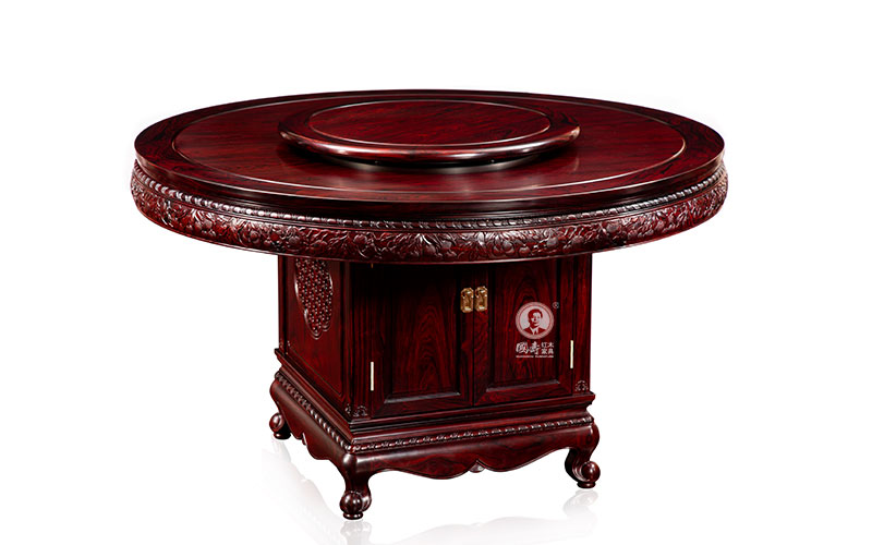 采用圆台设计,配以转盘,方便夹取菜品。宽阔直径,用餐空间充裕自在,轻松满足6-8人用餐。牙板处用经典的荔枝纹装饰,沉稳气派。桌墩处增加大空间收纳功能,提高利用率。腿足延续同个系列的广式三弯腿设计,坚实稳固,增添整体美感。