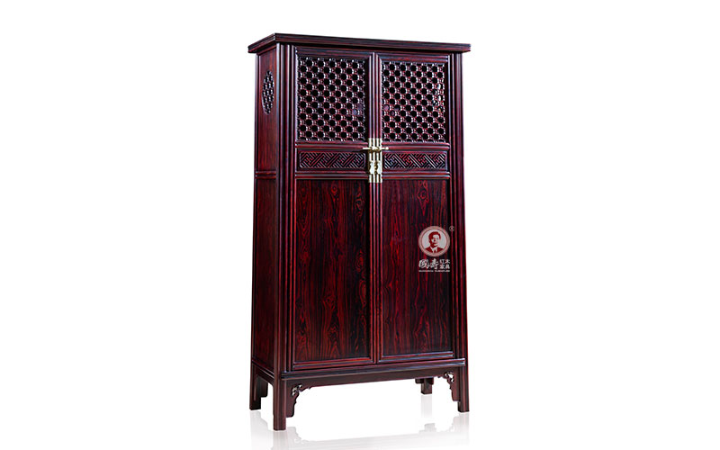 双开柜门,柜帽喷出,镶铜门杆,侧脚显著。内搁四层屉板,增设收纳空间。柜门上半部分为透格造型,腰部攒接卍字纹,并打洼处理,如一条玉带将上下分隔,使之更富层次感。上部攒斗海棠花纹,纵横交错,可谓锦上添花。其造型、工艺均十分考究,令人见其风致,便有一种高雅绝俗之趣。